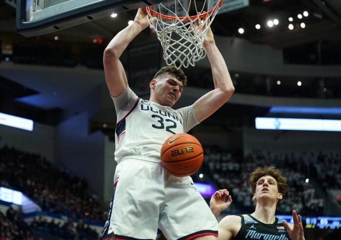 Donovan Clingan led a balanced attack with 17 points on 7-of-8 shooting from the floor, while adding 10 rebounds. Tristen Newton had 15 points with eight rebounds and eight assists, while Cam Spencer and Hassan Diarra each had 14 points.
