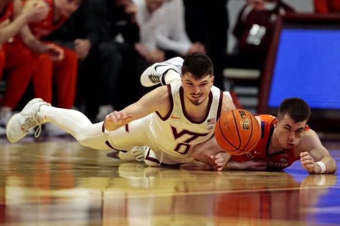 Virginia Tech’s all-time leading 3-point shooter, Hunter Cattoor, was kicked in the face inadvertently by Clemson’s RJ Godfrey and had to exit in the first half. Cattoor would not return.