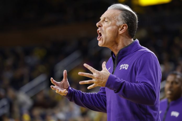 The Braves’ promising start fizzled midway through the first half following Daniel Braster’s 3-pointer that cut the TCU advantage to 21-16 at the 9:31 mark. Wenzel responded with consecutive 3s that pushed the Horned Frogs to a 29-18 lead and keyed a 12-2 run that eventually extended that margin to 15 points on Frankie Collins’ layup with 5:43 left in the half.
