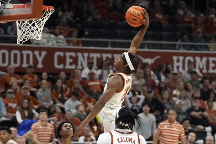 The Longhorns burst out of the gate, scoring 10 of the first 12 points, capped by a layup by Kaluma at the 17:30 mark of the first half. Texas stoked its advantage to 15 when Johnson poured in a 3-pointer with 12:11 left in the half, then upped the margin to 25-6 on Tramon Mark’s basket from beyond the arc just more than a minute later.