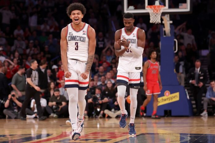 All five starters — Tristen Newton, Cam Spencer, Alex Karaban, Stephon Castle and Donovan Clingan — have taken turns leading the attack, and all five had double-figure scoring averages on the season. It was Clingan’s time on Saturday, pairing 22 points with 16 rebounds as he carried the team through a first half of cold perimeter shooting.