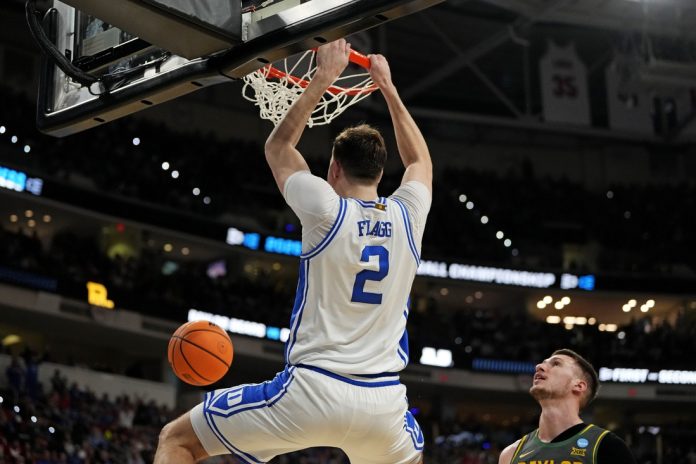 Flagg picked up his second foul with an offensive infraction with 6:58 left in the first half and sat out for about three minutes. He was unfazed, with his 3-pointer extending the Blue Devils’ lead to 40-30 with more than two minutes left in the half.