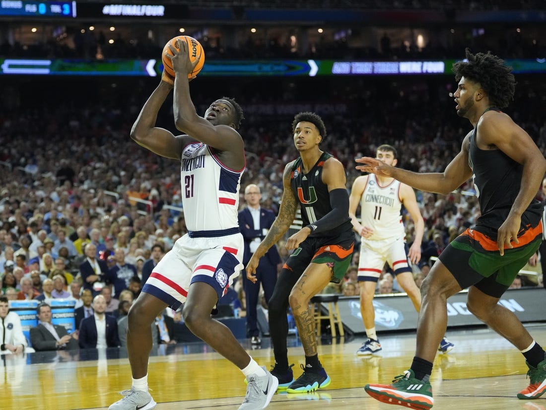 UConn was on fire from the perimeter at the start, drilling three 3-pointers — two from Sanogo — to seize a 9-0 lead. But as they did against Texas in the Elite Eight, the Hurricanes fashioned a response, and when Pack drained a 3 with 8:20 left in the first half, Miami pulled even at 19-19.