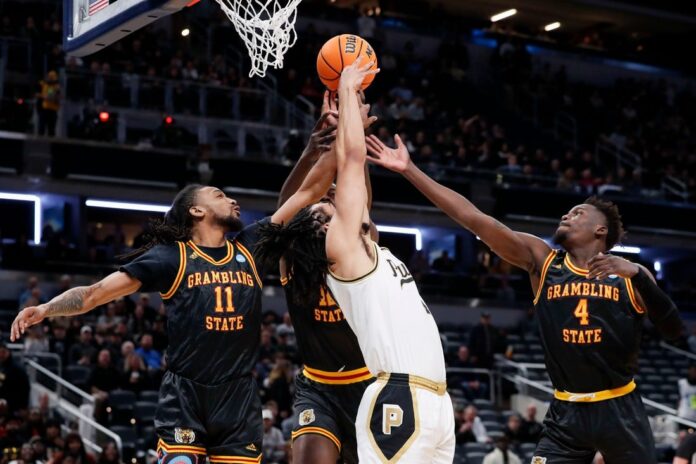 INDIANAPOLIS — All-American Zach Edey scored 30 points, grabbed 21 rebounds and blocked three shots to power the top seed Purdue Boilermakers to a 78-50 Midwest Region first-round rout of the No. 16 Grambling State Tigers Friday night.