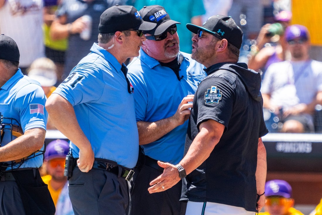 Miller was cited for berating the NCAA national coordinator of umpires at Charles Schwab Field in Omaha, Neb., after Miller was apparently frustrated by an umpire’s decision to eject Coastal Carolina coach Kevin Schnall and assistant Matt Schilling in the first inning of what was ultimately a 5-3 loss to LSU on June 22.