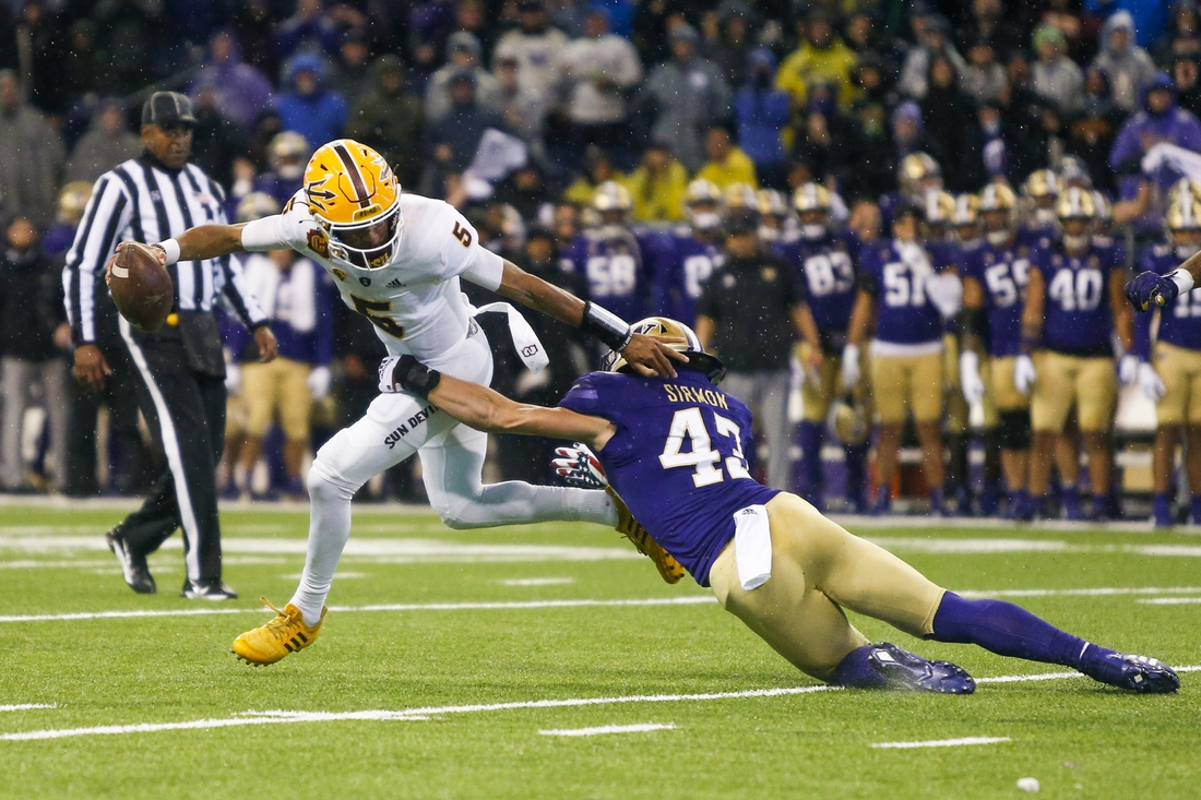 Rachaad White rushed for 184 yards and two touchdowns, including the go-ahead score with 1:11 remaining, as Arizona State rallied from a 14-point deficit to defeat Washington 35-30 in a Pacific-12 Conference game on a rainy Saturday in Seattle.