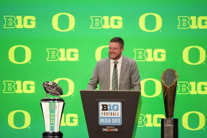 With a pair of trophies on display on either side of his dais at Mandalay Bay for Big Ten Media Days on Wednesday, Oregon’s coach shared his uncomfortable truth.