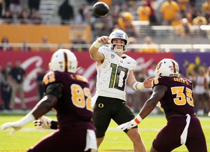 Nix completed 24 of 29 passes and matched the school record of six TD throws shared by Joey Harrington, who did it twice, and Justin Herbert, Vernon Adams, Marcus Mariota, Darron Thomas, and Danny O’Neill. Nix’s bid for a seventh was negated by an offensive pass interference penalty in the end zone on the opening drive of the third quarter.
