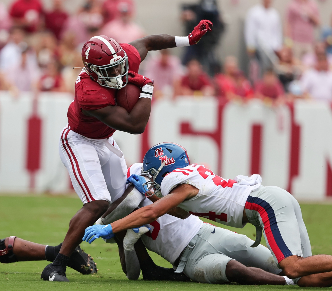 After another stop of the visitors on fourth down at the Ole Miss 47, Robinson burst through on Alabama’s first fourth-down attempt for a 1-yard score and a 14-0 lead with 12:14 left in the second quarter.
