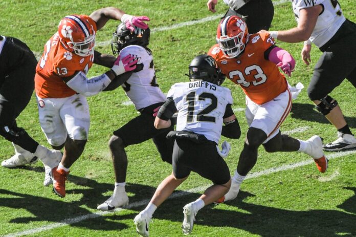 Clemson went up 10-3 on Jonathan Weitz’s 25-yarder at the end of a 15-play, 67-yard possession. Dennis was good from 22 yards out at the end of Wake Forest’s 12-play, 71-yard drive.