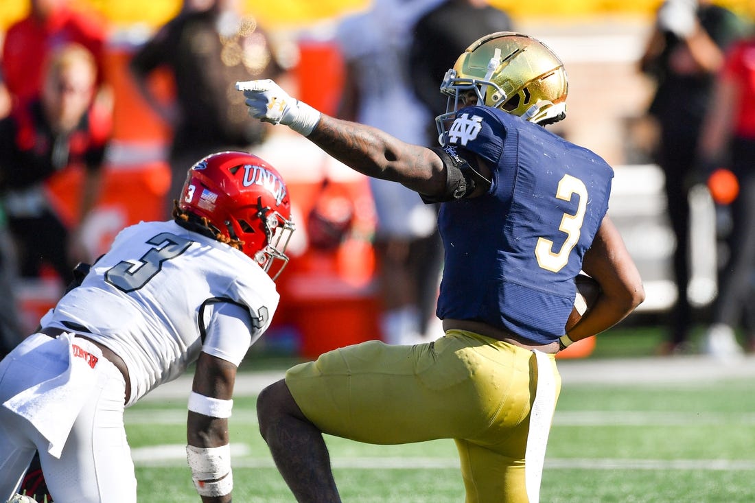 Notre Dame’s special teams set up the next score as Foskey rushed in untouched and swatted punter Marshall Nichols’ drop to the ground before Nichols could boot it away. That set up the Irish at UNLV’s 20-yard line and Pyne found Mayer for a 20-yard score to push the lead to 17-7 with 6:24 left in the first.
