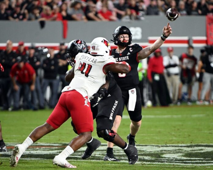 After Louisville moved in front in the fourth quarter, NC State’s defense forced fourth down, but a running-into-the punter infraction allowed the Cardinals to retain possession. The Wolfpack, without any timeouts, got the ball back at their own 34 with 1:44 to go, but Quincy Riley intercepted an Armstrong pass on the next play.