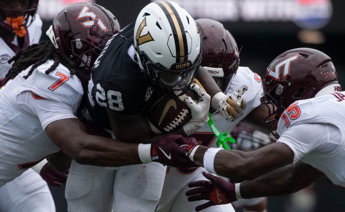 The Hokies trailed 17-3 at the break but came alive in the second half. They used three big plays on their first drive, the last, a Bhayshul Tuten 24-yard touchdown run over the left side with 12:42 left in the second half, to cut into Vanderbilt’s lead.