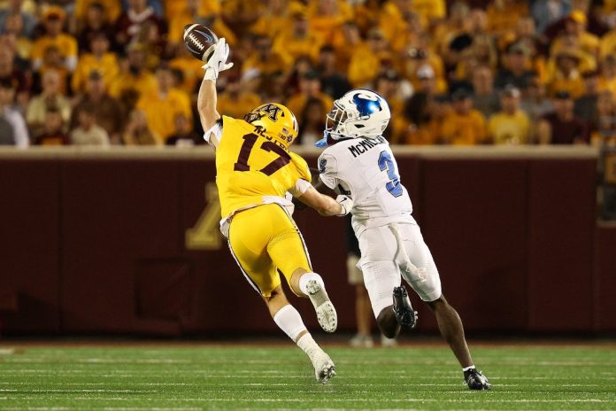 The Golden Gophers finally found a crack in Buffalo’s defense during their next drive. Lindsey stepped up in the pocket and fired a pass to Smith, who made the catch near the 30-yard line and sprinted the next 30 yards for a 60-yard touchdown to increase Minnesota’s lead to 23-10 with 10:52 remaining.