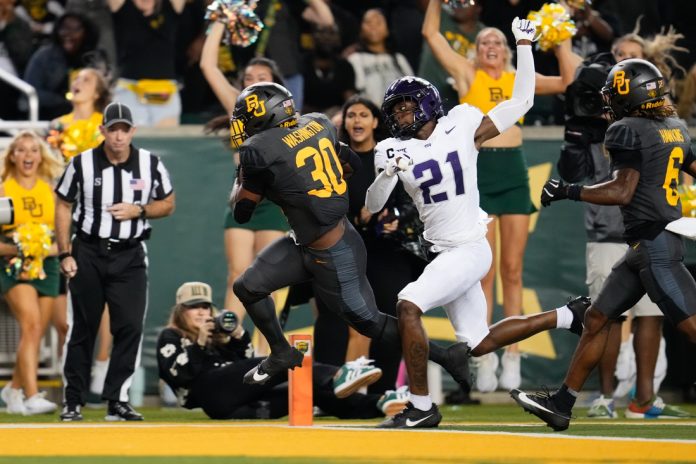 Washington’s fourth TD run — this one from a yard out with 4:54 left at the end of an 81-yard, 13 play march — put the Bears on top. TCU responded with Hoover’s touchdown pass to Bech with 1:55 remaining.
