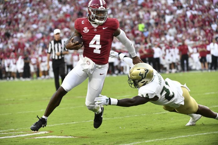 Milroe put Alabama ahead on a 10-yard scoring run with 5:08 left in the opening quarter. Cannon booted a 25-yarder to move South Florida within 7-6 with 9:45 left in the first half.