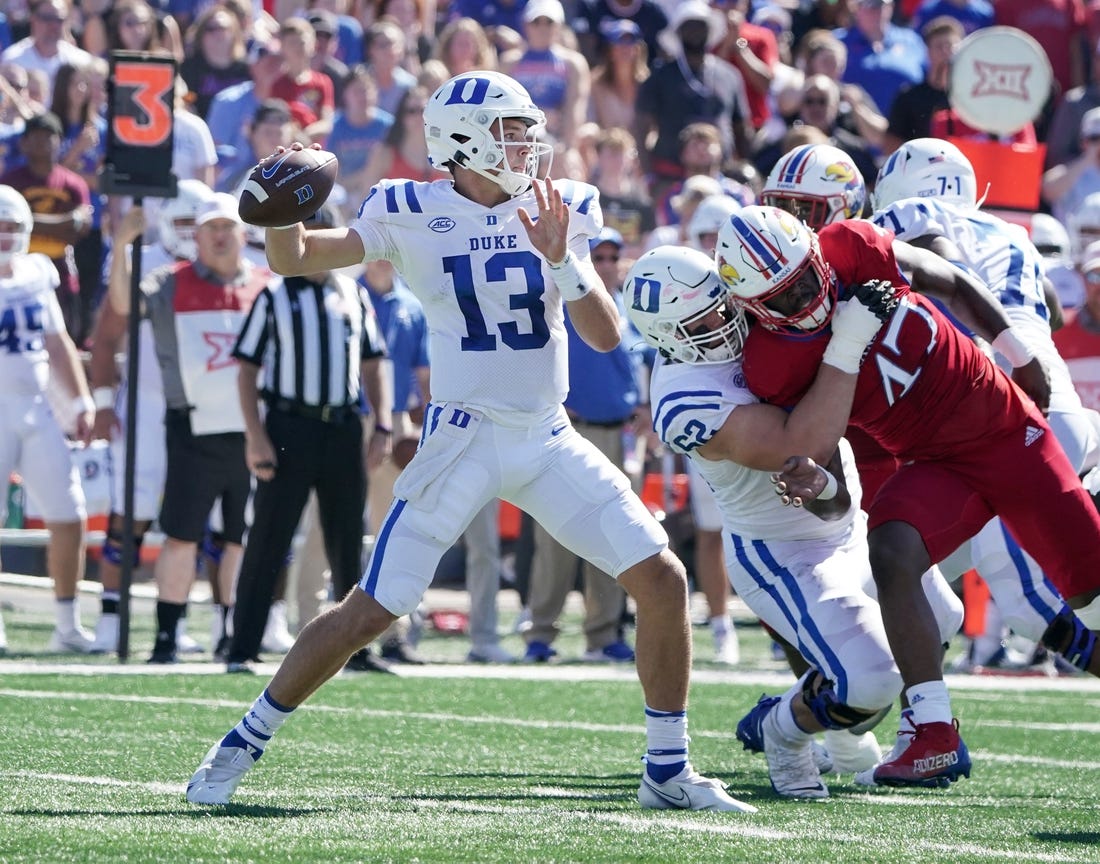 Kansas scored the game’s first points with 5:25 to play in the first quarter on Daniels’ 6-yard pass to Trevor Kardell. Less than two minutes later, Duke pulled even on Jaylen Coleman’s 5-yard run.
