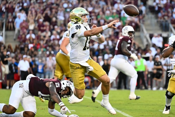 Riley Leonard completed 18 of 30 passes for 158 yards and rushed 12 times for 63 yards to win his Notre Dame (1-0) debut. Love finished with 14 carries for 91 yards and a score, and Jadarian Price ran for 44 yards and a touchdown.