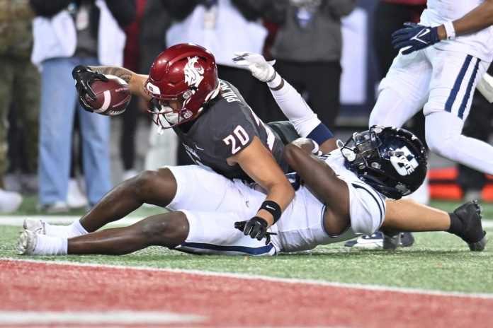 John Mateer threw for four touchdowns and ran for a fifth Saturday night as No. 21 Washington State kept its longshot hopes of a College Football Playoff berth alive with a 49-28 thumping of Utah State in Pullman, Wash.