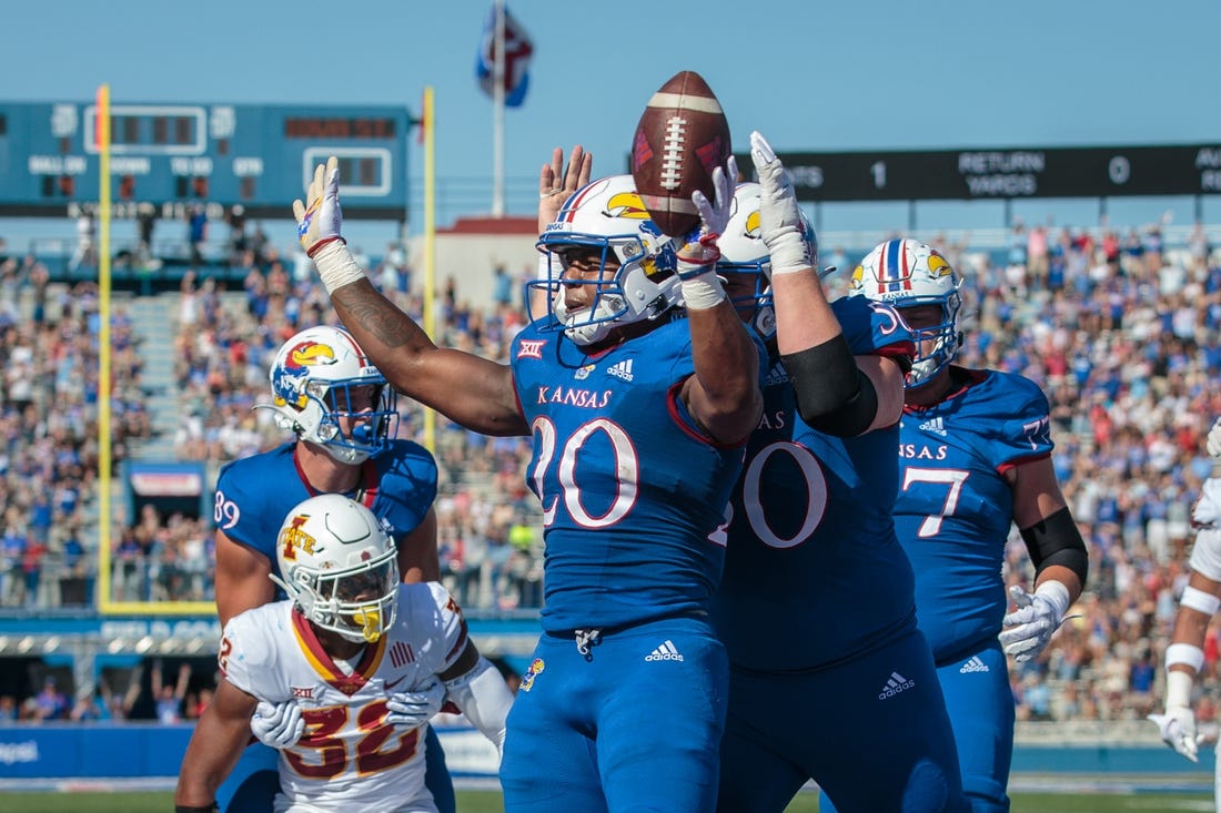 Kansas quarterback Jalon Daniels finished 7 of 14 for 93 yards and ran for just 15 yards but added a rushing score. Devin Neal led Kansas’ rushing attack with 75 yards on 12 carries. Daniel Hishaw rushed for 28 yards and scored a TD, but the running back was carted off the field after losing a fumble with 9:05 remaining in the game.