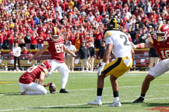 Konrardy kicked three field goals with the final boot ending Iowa State’s six-game home losing streak in the series.