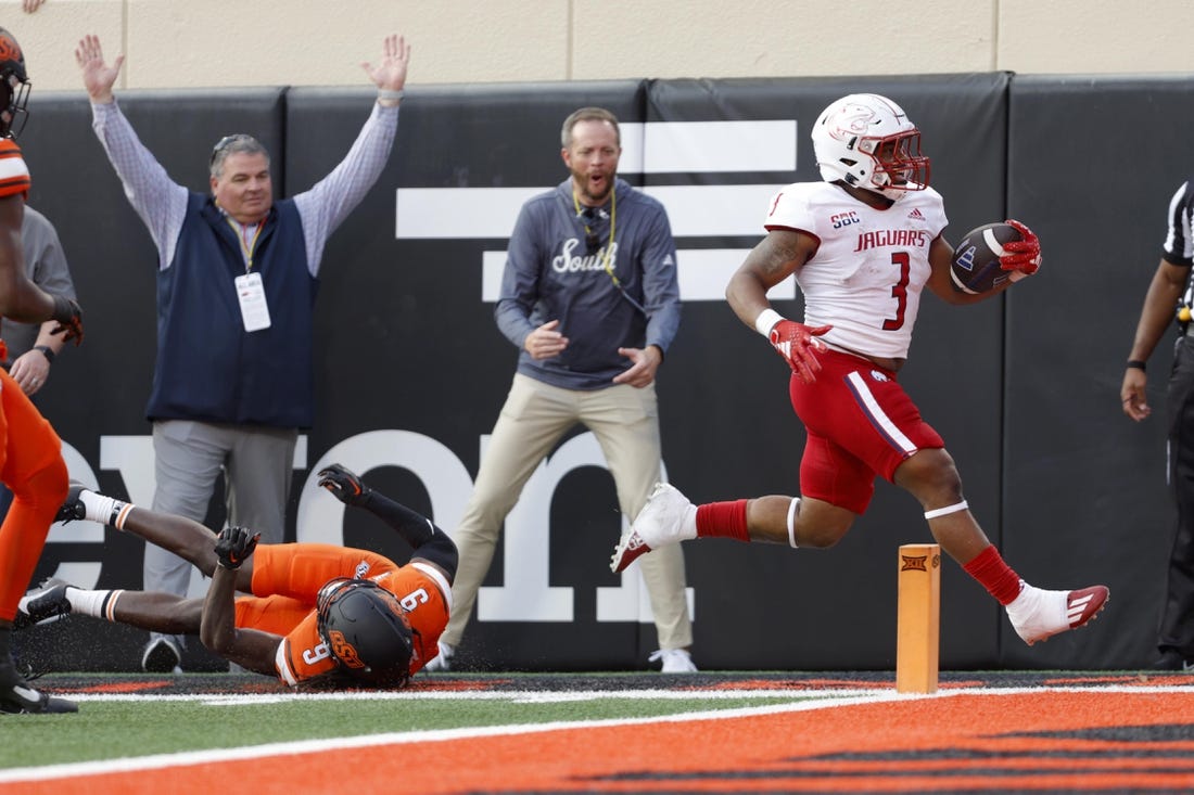 La’Damian Webb rushed for 151 yards and a pair of touchdowns as South Alabama stunned Oklahoma State 33-7 on Saturday night in Stillwater, Okla.