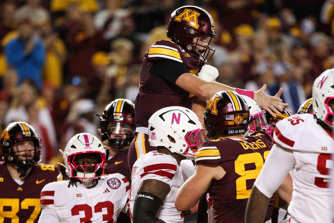 The Gophers sacked Nebraska’s Dylan Raiola nine times, breaking the program’s previous record set in 1990 and matched in 2000, after only recording 14 in the first six games. It was the second time this season Raiola, who completed 17 of 25 passes for 177 yards, had been sacked at least seven times and the most allowed by the Cornhuskers (5-2, 2-2) since 2005.