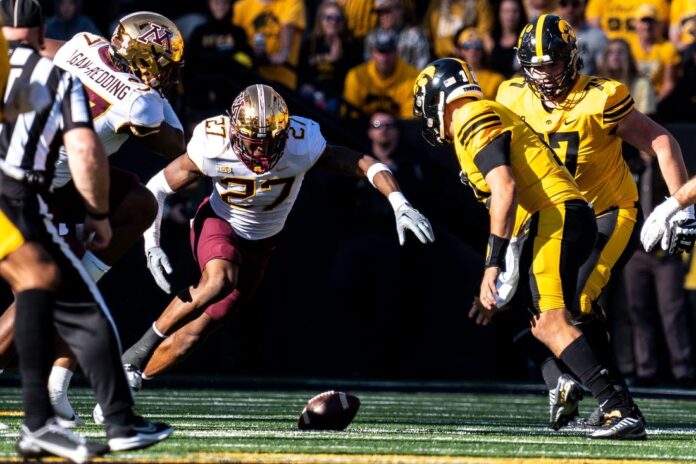 Iowa’s Cooper DeJean appeared to return a punt 54 yards for a touchdown that would have put the hosts ahead 16-12. DeJean allowed the ball to bounce before receiving the punt near the Minnesota sideline, then made multiple defenders miss before cutting back across the field.