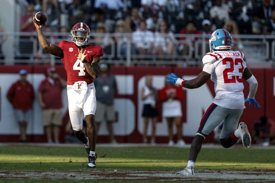 Jalen Milroe is entrenched as the Alabama starting quarterback. He completed 17 of 21 passes for 225 yards, one touchdown and one interception against Ole Miss after being benched the previous week against USF.