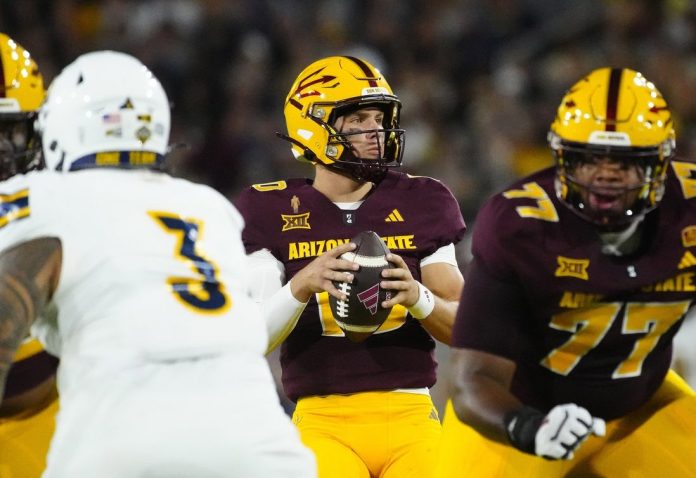 Arizona State quarterback Sam Leavitt accounted for four touchdowns, two passing and two rushing, against Northern Arizona, throwing for 257 yards and rushing for 73. He threw one interception. Top target Jordyn Tyson had 12 receptions for 141 yards and two scores.