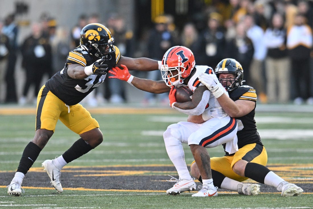 Iowa broke to a 2-0 lead on Illinois’ first possession with its FBS-leading third safety of the season. Facing third-and-long from the 5, Paddock fumbled in the end zone while in defensive end Joe Evans’ grasp. Illini tackle Zy Crisler recovered in the end zone at the 11:24 mark of the first.
