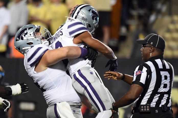 Dylan Edwards capped an eight-play, 60-yard drive with a 1-yard TD run with 1:52 left in the second quarter to put Kansas State up 14-7.