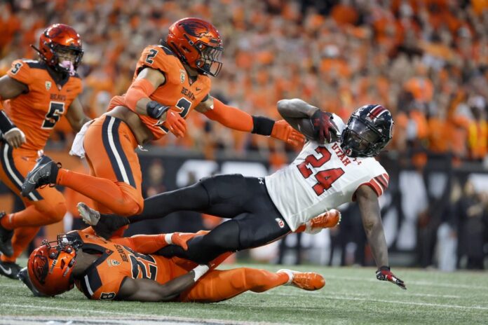 Oregon State’s Silas Bolden accounted for two touchdowns and Easton Mascarenas-Arnold recorded a key interception as the No. 19 Beavers notched a 21-7 victory over No. 10 Utah on Friday night in their Pac-12 matchup at Corvallis, Ore.