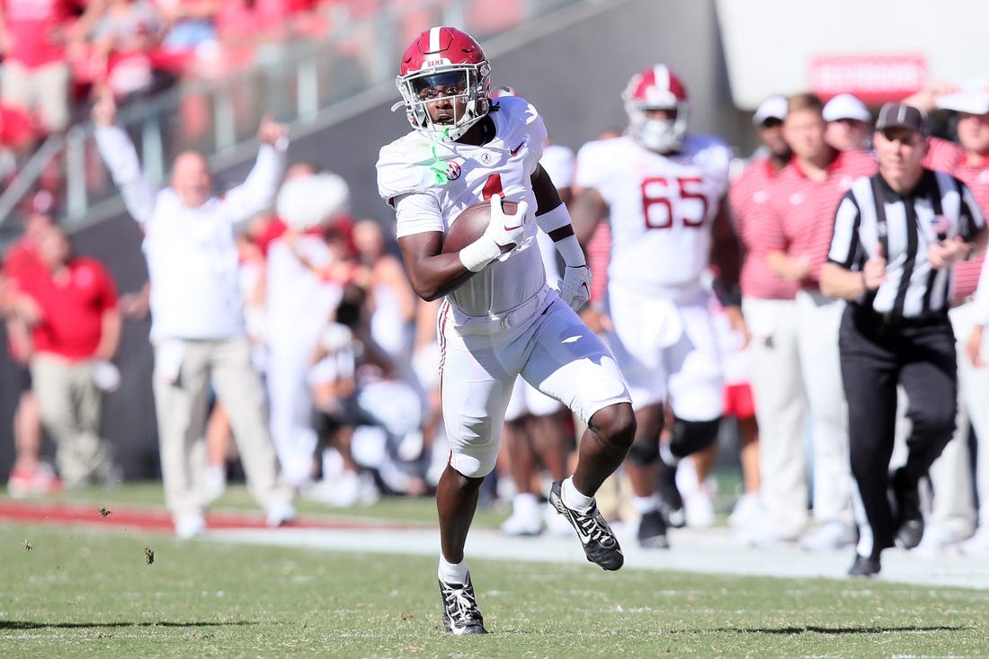 Jahmyr Gibbs ran for 206 yards, most of which came on two long touchdown runs, to help the Alabama Crimson Tide to a 49-26 victory over the host Arkansas Razorbacks on Saturday night in Fayetteville, Ark.