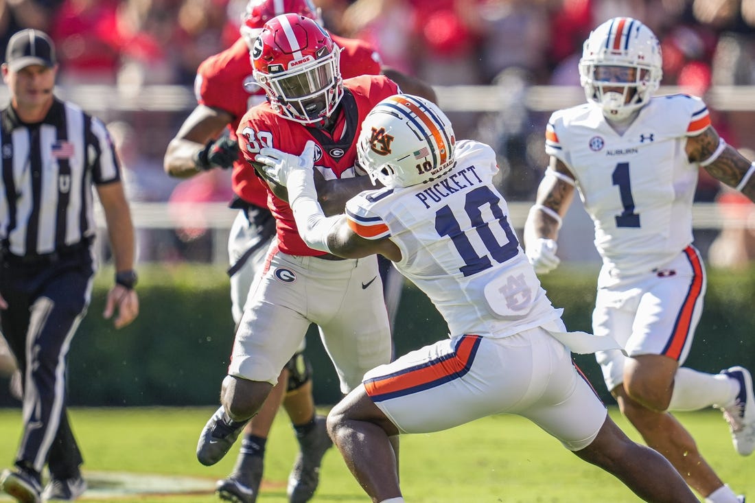 When the Tigers tried a run from punt formation on a fourth-and-6, the Bulldogs’ Nolan Smith stuffed John Samuel Shenker for a 2-yard gain as Georgia took possession at the Auburn 36.