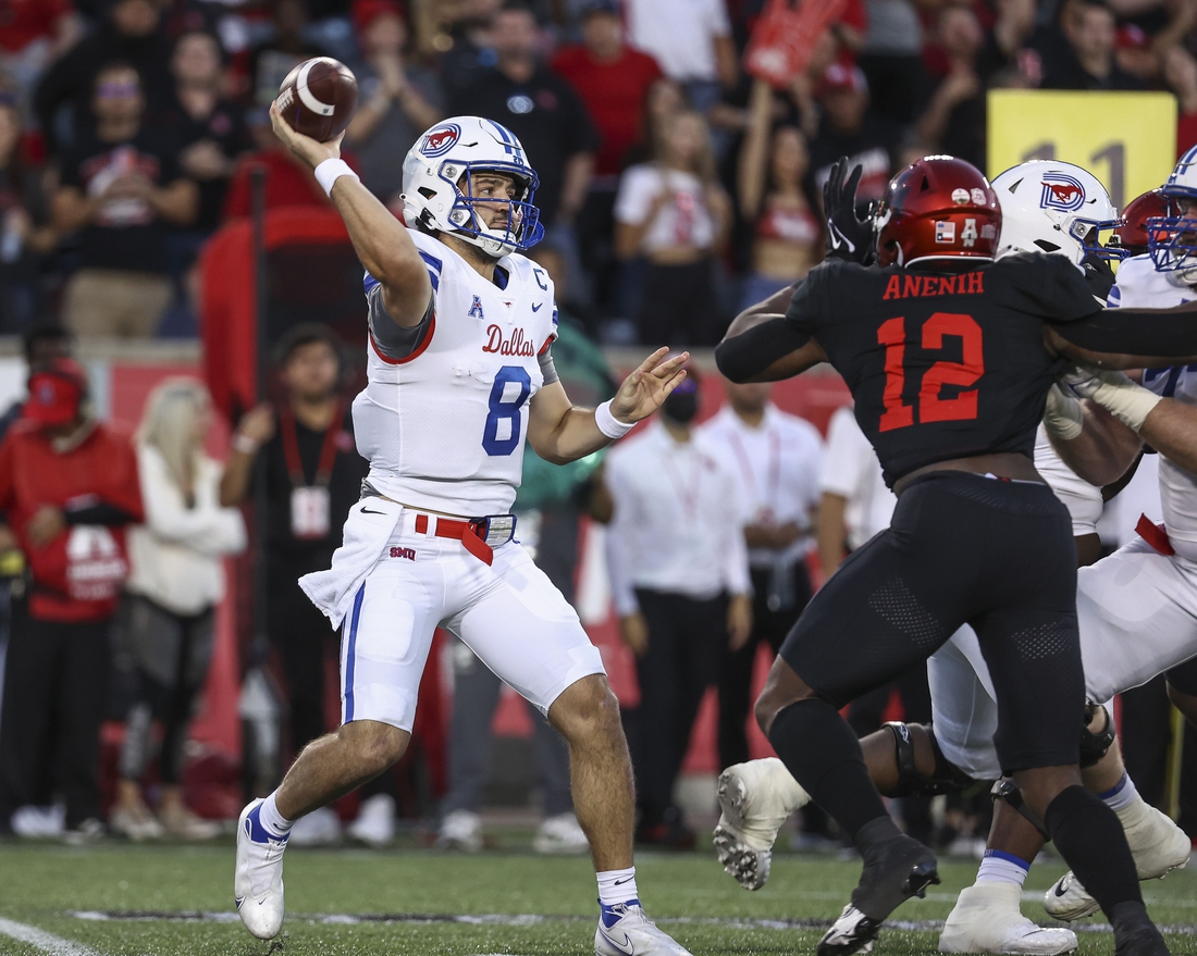SMU’s Tanner Mordecai has played well this season, ranking second in the nation with 32 touchdown passes. That total is just two shy of Shane Buechele’s school record, set in 2019.