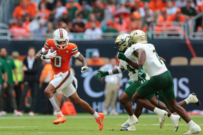 The No. 5 Hurricanes (3-0) totaled 576 yards and jumped out to a 14-0 lead over the No. 18 Bulls (2-1), who earned their ranking after beating then-No. 25 Boise State and then-No. 13 Florida to open the season.