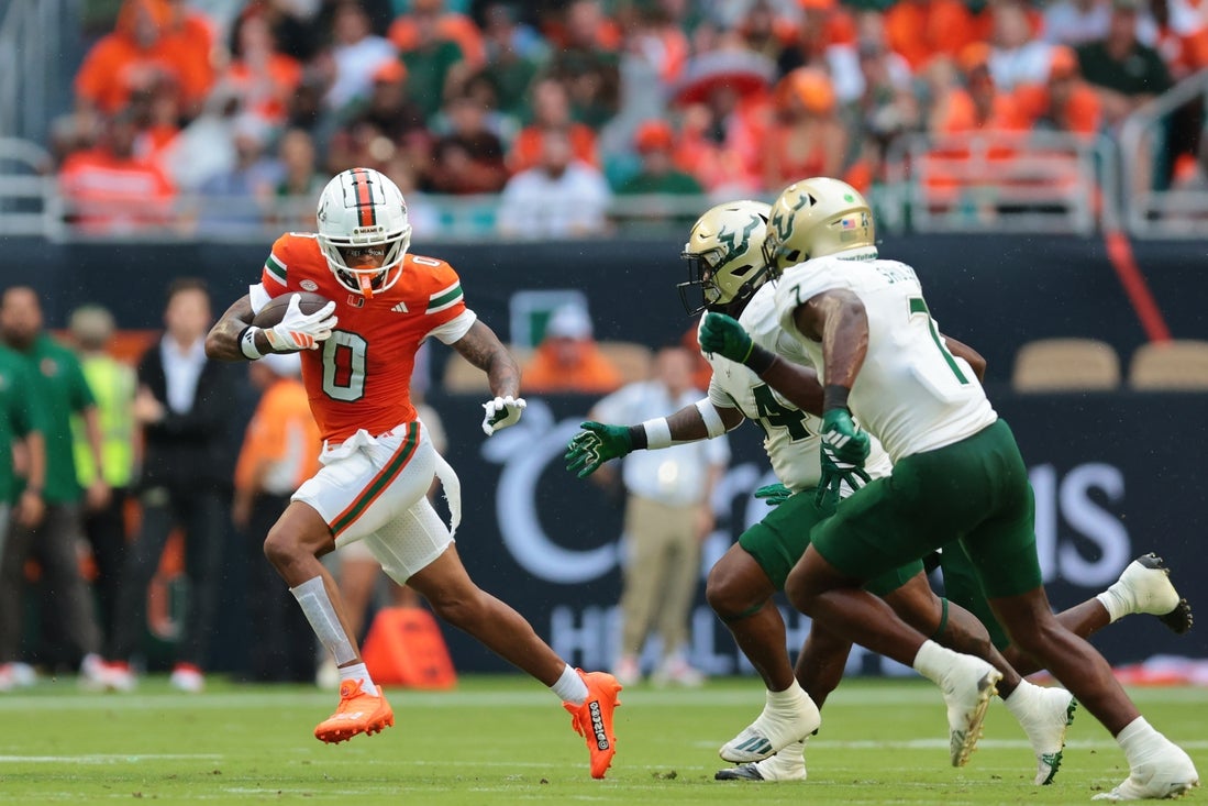 Jarvis Lee and James Chenault recorded interceptions for the Bulls. After Beck’s second interception, Miami’s Jakobe Thomas stripped Brown of the ball and Chase Smith recovered.