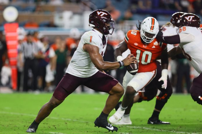 Virginia Tech (2-3, 0-1) was led by quarterback Kyron Drones and running back Bhayshul Tuten.