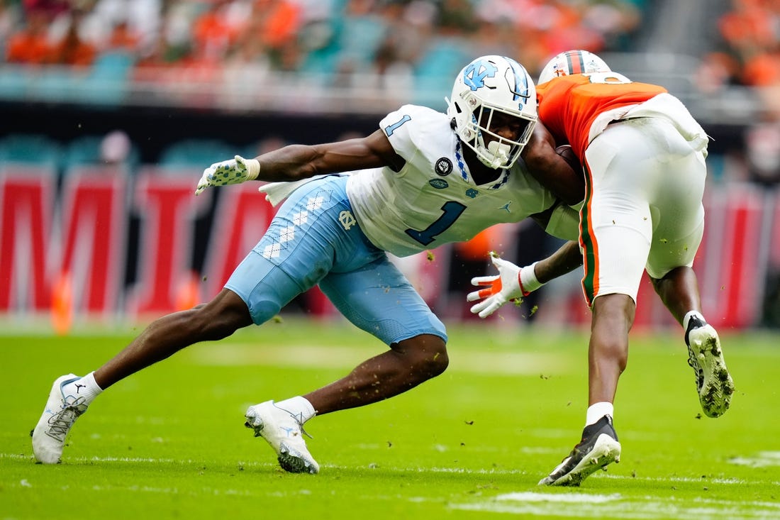 Miami was in position to tie the score with 12:31 left in the fourth quarter, but Jaylan Knighton fumbled on a third-down run. Cedric Gray forced the fumble, recovered by Gio Biggers at the UNC 17.