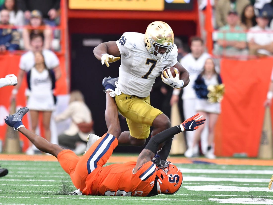 Audric Estime and Logan Diggs combined for 208 rushing yards and three touchdowns as visiting Notre Dame knocked off No. 16 Syracuse 41-24 on Saturday afternoon.