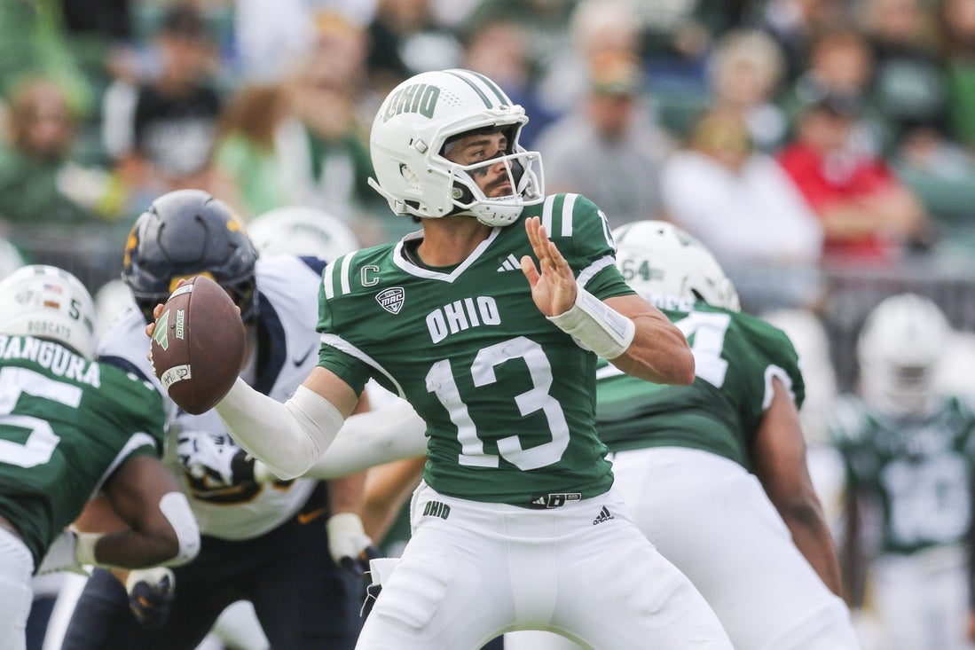 Ohio quarterback Parker Navarro threw for 247 yards and ran for 87 more to lead the Bobcats (1-1) to their first win against the Mountaineers (1-1) in the fifth all-time matchup.