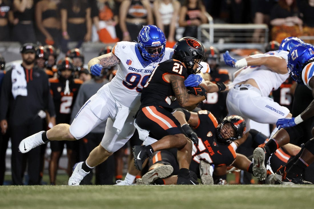 Boise State threatened to get on the board but Ashton Jeanty fumbled with Grant recovering at the Oregon State 4 with 4:44 left.