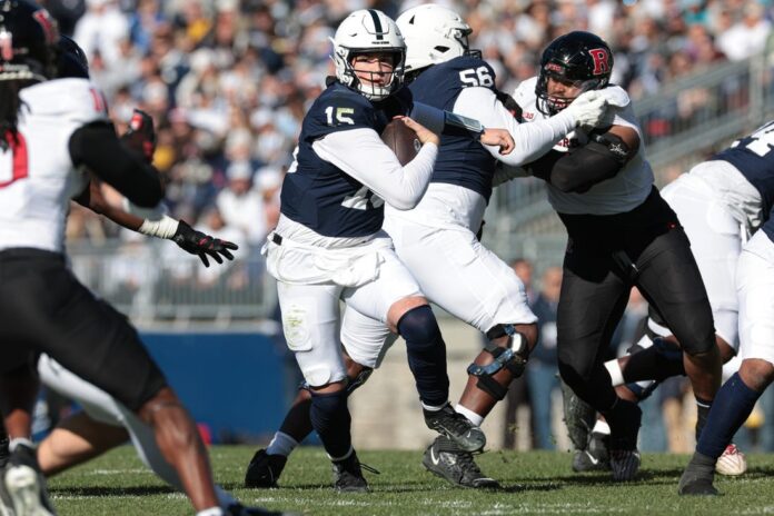 Penn State quarterback Drew Allar exited Saturday’s 27-6 victory over Rutgers with an unspecified upper-body injury.