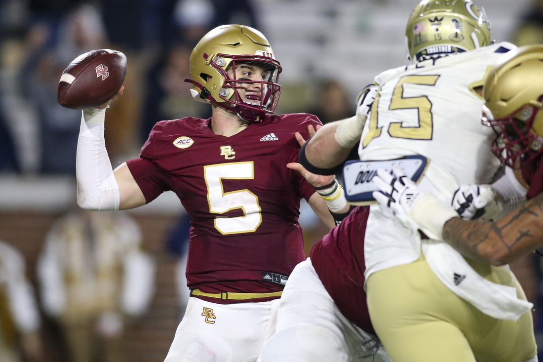 Jurkovec was 13-of-20 for 310 yards and two passing touchdowns while rushing for 71 yards and three more scores in BC’s 41-30 shootout victory at Georgia Tech last Saturday. Pat Garwo III rushed for 104 yards while Zay Flowers had two catches for 87 yards and a pair of TDs.