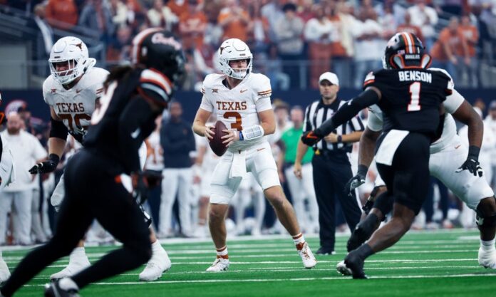 Quinn Ewers passed for a record 452 yards and four touchdowns, and No. 7 Texas’ defense did the rest in a 49-21 shellacking of No. 18 Oklahoma State on Saturday afternoon in the Big 12 championship game in Arlington, Texas.