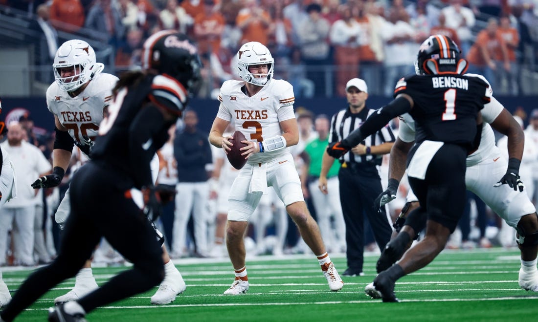 Midway through the second quarter, the Cowboys’ Nickolas Martin intercepted Ewers and returned the pick 27 yards to the UT 3. Bowman then passed to Rashod Owens for a 7-yard TD that culled the Texas lead to 28-14 with 5:50 remaining.
