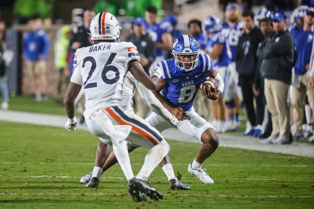 Duke built a 28-7 lead by scoring on its first possession of the second half on Leonard’s 1-yard run. After a goal-line stand punctuated by a sack resulted in a Virginia field goal, the Blue Devils put it away in the first minute of the fourth quarter on Jaquez Moore’s 59-yard run.
