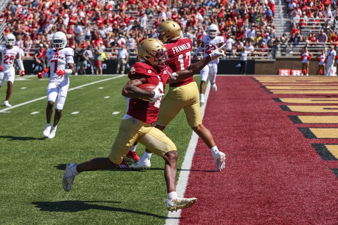 BC’s Zay Flowers caught a pair of first-half touchdown passes from Phil Jurkovec, who was 23 of 41 for 283 yards and three touchdowns. Flowers had 141 yards of offense, 125 receiving.