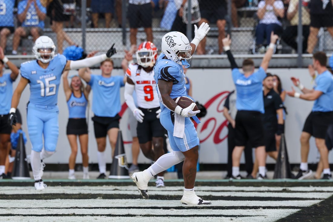 A week after gaining its first conference victory in its first season in the Big 12, UCF (5-5, 2-5) won its second straight in dominant fashion as John Rhys Plumlee threw three touchdown passes, all to Kobe Hudson.